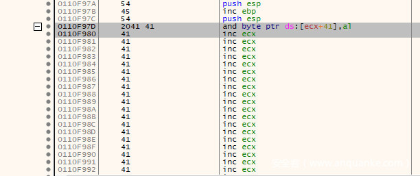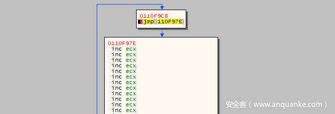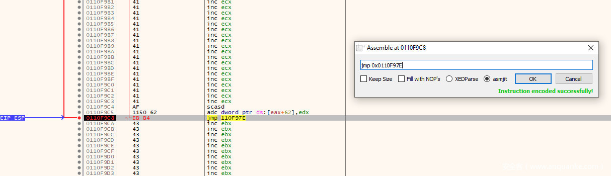 可以得到这70个字节的区域的起始地址为:0x0110F980-2=0x0110F97E。回到$esp指针指向的位置双击指令(inc ebx)或在选中指令时按空格键,打开Assemble对话框,输入jmp 0x0110f97e,点击OK,它将自动计算跳转距离并创建一个跳转指令:EB B4。