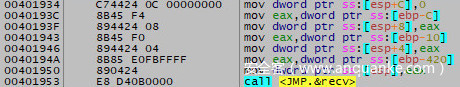 由于套接字是传递给recv的第一个参数,同时也是push到堆栈的最后一个参数,我们需要找到在调用recv之前,最后一个向栈内写数据的操作。很容易就能发现,在调用指令的正上方,有一个mov操作,它将存储在$eax中的值移动到$esp指向的地址(即栈顶)。