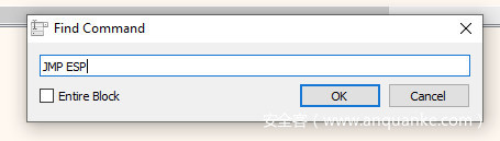 我们双击.text部分,进入CPU选项卡。在这里,我们可以使用ctrl+f快捷键搜索指令,或者右键单击并选择搜索>当前区域>命令(Search for > Current Region > Command)。在出现的窗口中输入要搜索的表达式,在本例中是jmp esp,如图所示:
