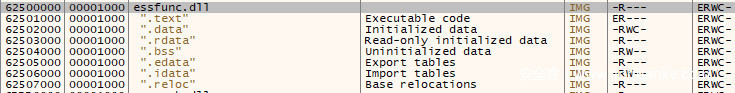 在x64dbg中,我们可以在内存映射选项卡(Memory Map)查看程序调用的DLL,通过调用DLL来实现这一点。如下图所示,我们可以看到只有一个感兴趣的DLL:essfunc.dll。