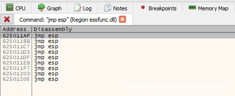 在上一个对话框中单击OK之后,我们现在将看到在essfunc.dll的.text中的jmp esp实例,这里我们使用第一个(0x625011af)。