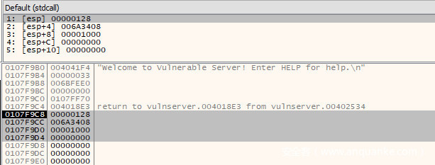 如果我们现在在<jmp.&recv>指令上设置断点并继续执行,我们将能够查看传递给堆栈上的函数的参数。