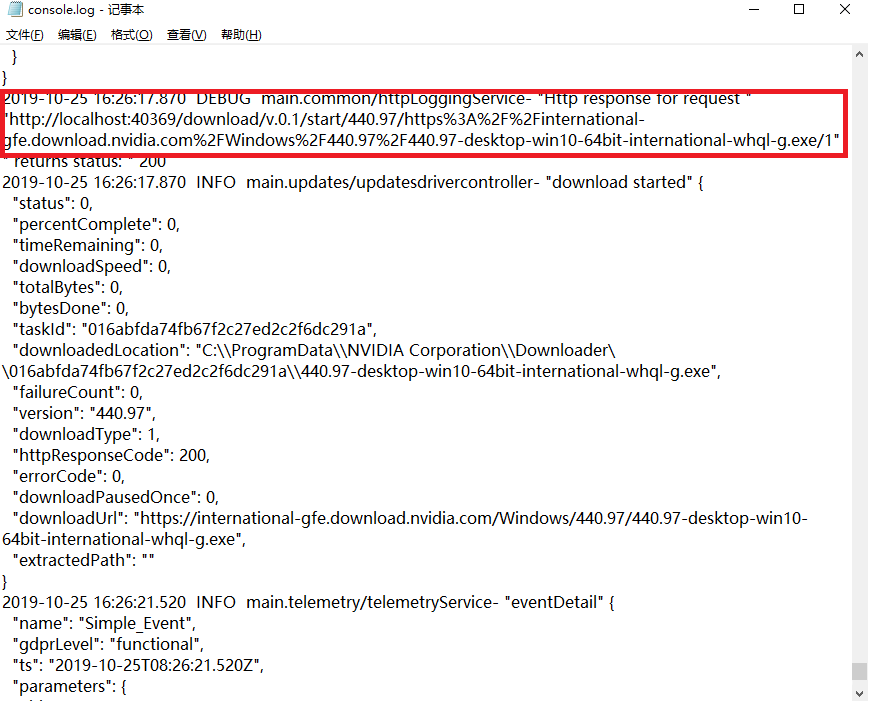 可以看到该API包含三个参数version,url,downloadType,这三个参数中的version代表所下载驱动的版本,不用特别关注,downloadType指下载类型,也不用特别在意,url应该就是NVIDIA提供的驱动程序下载链接了,那么如果我将此处的url替换成其他来源的文件,岂不是就能够把任意文件植入用户的机器上了?但是此时,我还不知道这个API的参数是何种格式的,不过没关系,只要在GFE中触发一次驱动下载,GFE会将所有我需要的信息都写入console.log中: