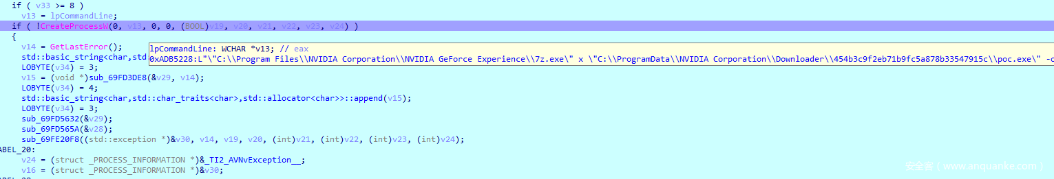 经过分析,可以发现v1[2]正是POST请求中的isPFW字段,所以应该在请求中将isPFW设置为true,然后再跑起来,终于在CreateProcessW处断下: