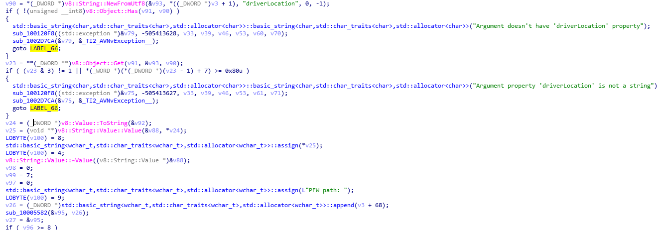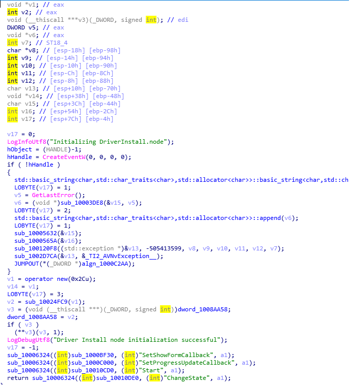 driverInstall.Start函数位于外部的DriverInstall.node中,所以接下来有请神器IDA,使用IDA载入DriverInstall.node,在导入表中找到v8::String::NewFromUtf8(v8::Isolate ,char const ,v8::String::NewStringType,int),查看交叉引用,定位到sub_1000C0D0,sub_1000C0D0函数的主要作用是绑定函数,如下图: