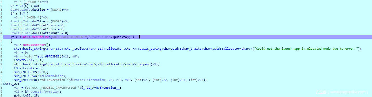 接下来我会发现貌似跟丢了2333,参数倒是解析了,但是最后是在哪里用到的呢?设想一下,驱动安装程序最后如果要得到执行,必然会调用CreateProcess或者ShellExecute之类的win32 API,那么何不先关注一下这个部分?那么按照这个思想,我很轻易就能够找到函数sub_100042CD,这是一个既调用了CreateProcessW又调用了ShellExecuteExW的函数,如下图: