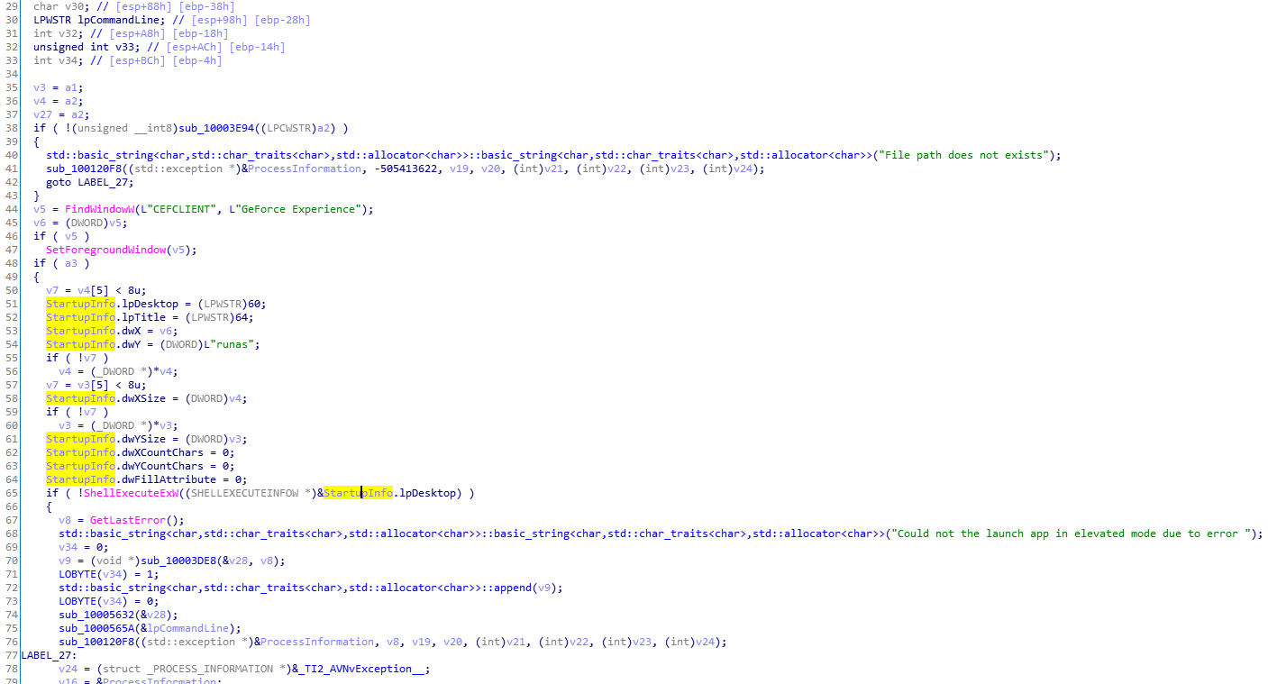 所以得继续修正我的POC,目前的想法是构造一个zip文件,内含setup.exe,将原来的poc.exe重命名为setup.exe,打包成poc.zip,再次跑起来,走完上述流程后,还是会到达签名检查的位置,程序依然会对setup.exe进行签名检查,那岂不是又没啦?不过天无绝人之路,想一想我将isPFW设置为true带来了什么变化?这使我的原语从只能植入单个文件“升级”到了能够植入多个文件,既然程序会对setup.exe进行签名检查,那好,就找一个具有NVIDIA有效签名的程序重命名为setup.exe呗,那么要如何执行代码?是的,我得想办法进行DLL劫持,DLL劫持一般不会被认为是多么严重的漏洞,但是在此处,就显得尤其关键,当然exe和DLL的选择也很有讲究,我最理想的情况是能够找到一个被有NVIDIA签名的程序加载的无签名DLL,我四处瞧了瞧,NVIDIA GeForce Experience.exe和libcef.dll看起来好像就很合适,所以使用我自己多年前写的一个DLL劫持(x64)的python脚本(参见https://github.com/InoriJam/DLL-hijack-X64 )来生成一份伪造libcef.dll的源码,源码生成完毕,将编译好的libcef.dll与setup.exe(NVIDIA GeForce Experience.exe重命名所得)一起打包成一个zip文件,再次执行,终于在ShellExecuteExW(evaluate mode)处断下,此处执行的即为setup.exe:
