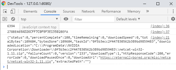 在POC中,需要按下Ctrl+V+Enter,按下Ctrl键时,隐藏控件里面包含的console.log路径%LOCALAPPDATA%NVIDIA CorporationNVIDIA GeForce Experienceconsole.log会被复制到剪贴板,然后打开一个文件选择对话框,此时按下V的作用是将路径粘贴到文件选择对话框中,再按Enter,console.log即被上传,通过正则匹配获取到端口号和secret值,构造XHR请求来发起文件下载,并打印Webhelper后端返回的信息,执行此POC后,可以看到控制台输出了如下内容: