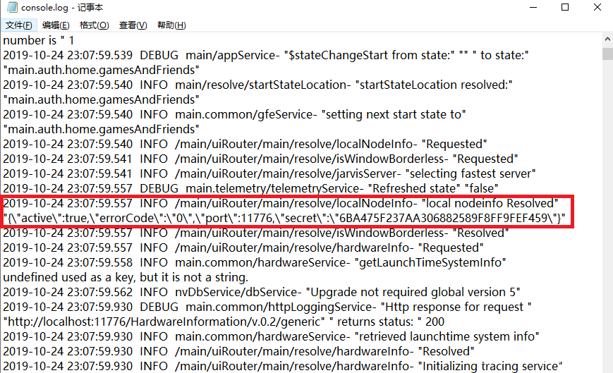 继续寻找我所需的nodejs.json,但是一开始我就傻眼了,没错,NVIDIA“机智”地把这个nodejs.json移除了,那岂不是没啦?难道我的漏洞挖掘还没开始就要结束?必不可能,我发现GFE会往%LOCALAPPDATA%NVIDIA Corporation下的几个子文件夹里面写入一些日志,那么这些日志有没有可能泄露一些蛛丝马迹?果不其然,我没费多大力气就在NVIDIA GeForce Experience文件夹下的console.log中发现了我想找的东西,GFE好巧不巧地将secret值和端口号写进了这个日志文件里边,如下图: