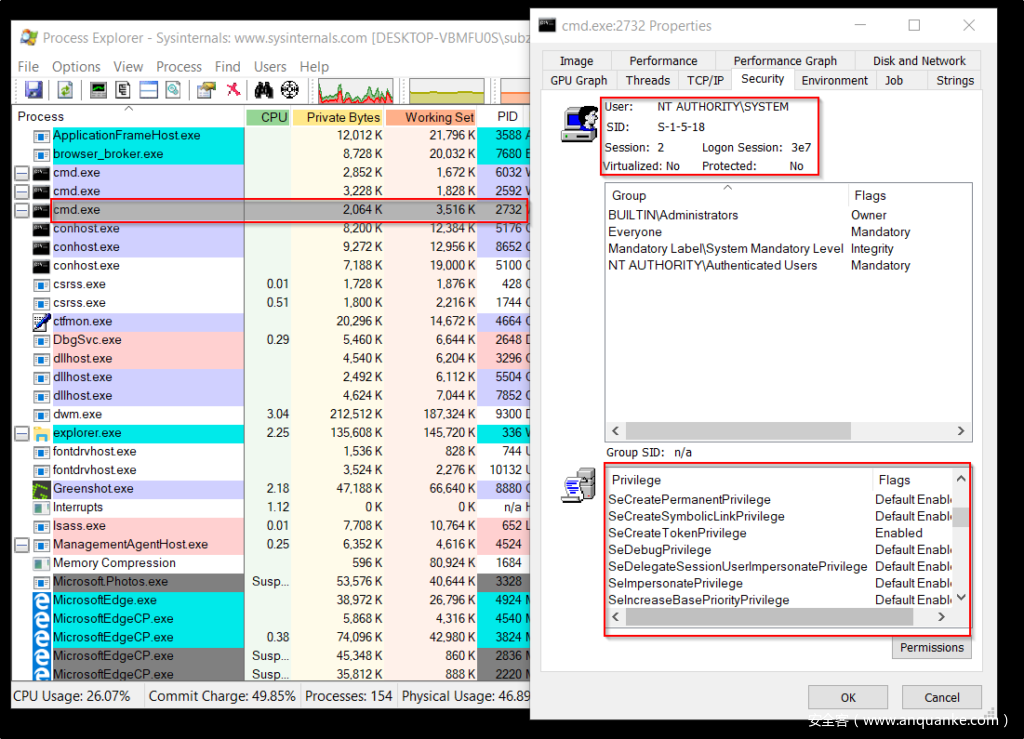 我们新生成的cmd.exe进程的PID为2732,该进程对应的用户为SYSTEM,这意味着该进程运行在SYSTEM的安全上下文中。此外,我们还可以看到新生成进程的SID、登录会话以及已启用的特权,这些信息与SYSTEM级别的进程保持一致。