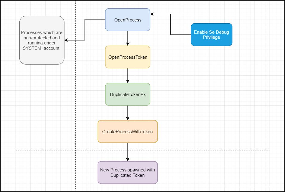 技术1:以运行在SYSTEM安全上下文中的进程为目标,复制该进程的主令牌(Primary Token),创建具备SYSTEM级别特权的进程。