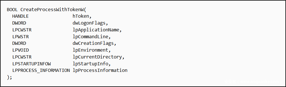 根据微软文档, CreateProcessWithTokenW()函数原型如下所示:
