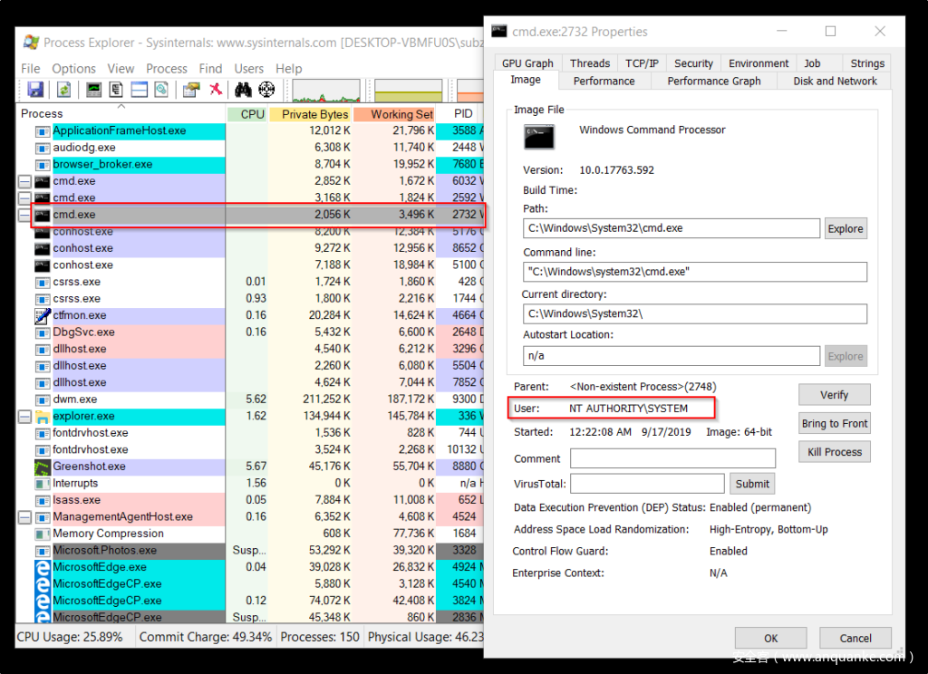 现在我们可以使用Process Explorer工具,查看新生成进程的相关信息,如下图所示:
