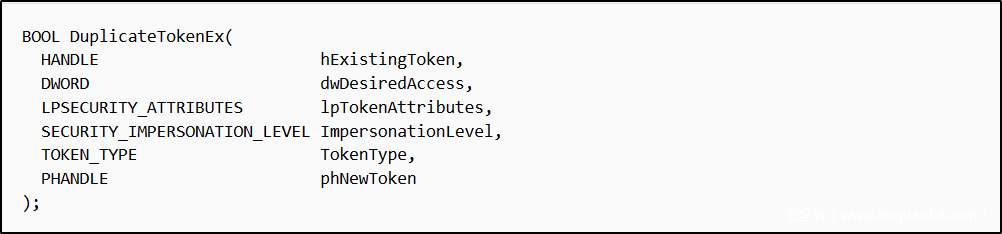 现在我们的主要任务是从已打开的令牌句柄中复制Primary令牌,为了完成该任务,我们可以声明一个新的HANDLE,用来保存复制令牌。为了复制目标令牌,我们可以使用DuplicateTokenEx()函数。
