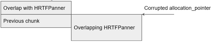 为了构建信息泄露,我使用了HRTFPanner类,该类的大小为1152,并且与我设法移动的AudioArray的allocate_字段位于同一容器中。理想情况下,我希望将HRTFPanner分配给损坏的location_指针的位置,让这个HRTFPanner的开头部分与占用前一个chunk的另一个对象的最后部分重合,如下图所示。