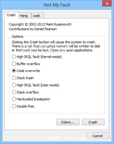 图20 有了NotMyFault,用户就可以通过GUI选择要生成的漏洞类型