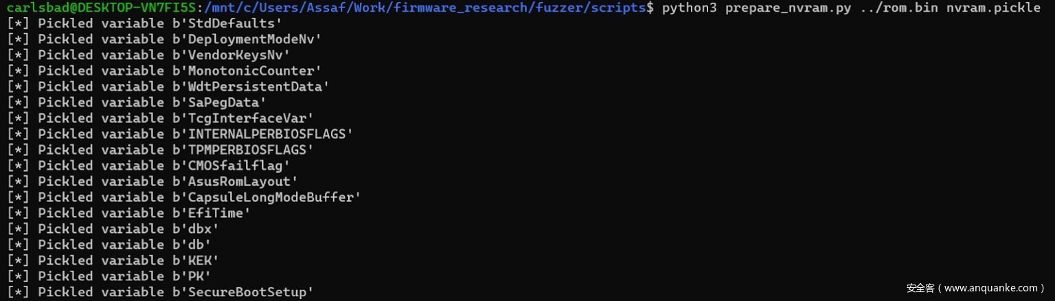 准备一个仿真的NVRAM环境,它将被Qiling用来服务于对GetVariable()的调用。出于灵活性的考虑,fuzzer不会直接从SPI转储中使用其NVRAM存储,而是从事先准备好的序列化Python字典中使用NVRAM存储。要通过SPI转储创建该字典,可以使用以下命令: