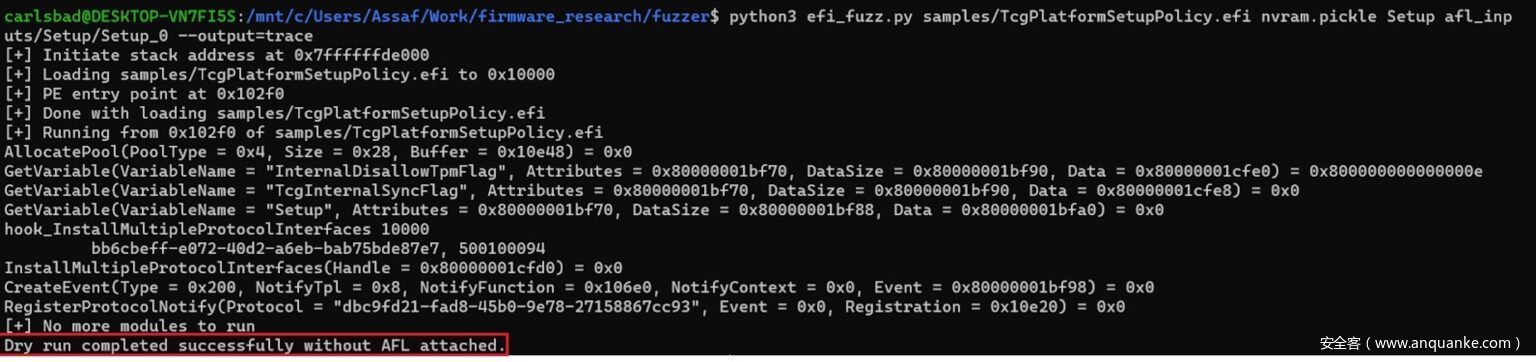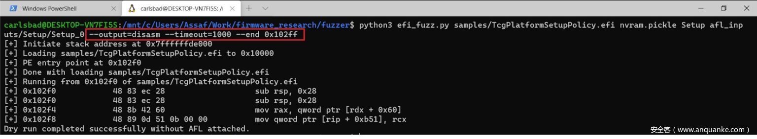 有时,试运行可能会在NVRAM变量解析运行很长一段时间后才崩溃。在这种情况下,我们可能会采用部分仿真的方式。要启用这一功能,只需将-end参数与最后一条要模拟的指令的十六进制地址一起传递给fuzzer即可。
