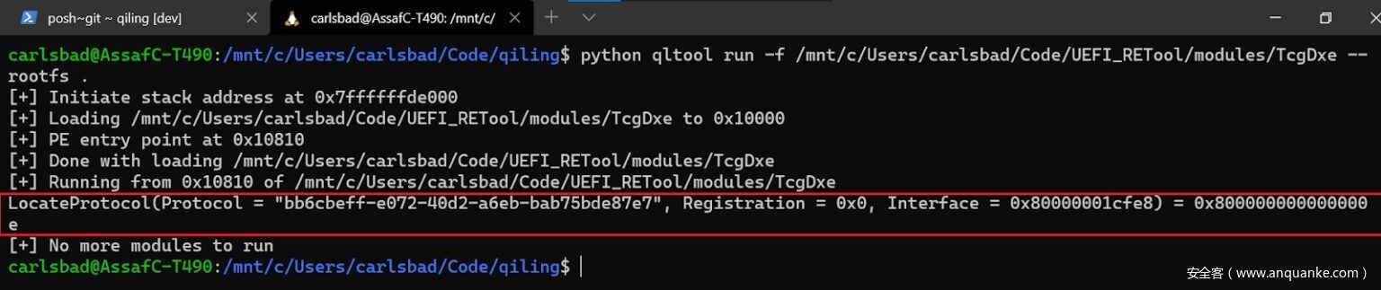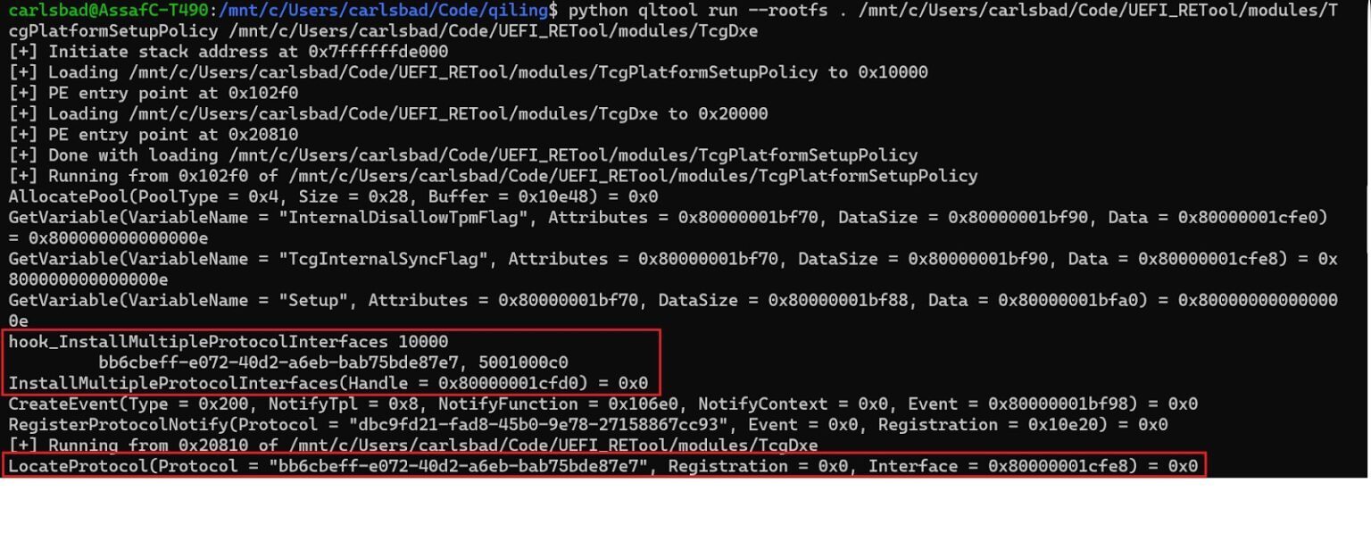 经过研究,我们发现我们感兴趣的协议确实会被另一个名为TcgPlatformSetupPolicy的模块注册。知道了这一点,就可以将这两个模块加载到仿真环境中,从而满足TcgDxe的依赖关系。