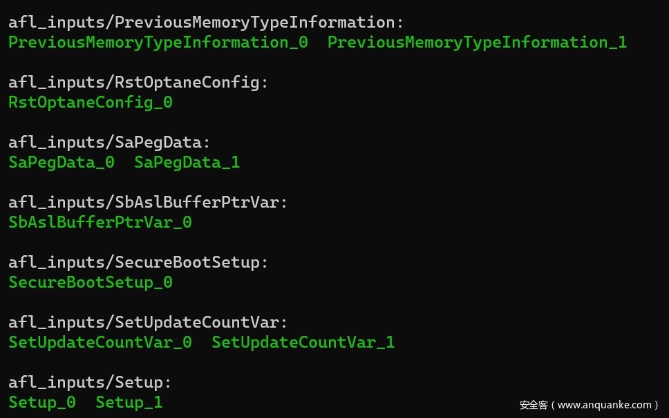 运行该脚本后,所有seed文件将整齐地保存在afl_inputs目录下。根据设计,每个变量都有自己的专用子目录。另外,请注意,当在SPI转储中发现了同一个变量的多个实例(可能在不同的FV上)时,每个种子文件都将以其顺号作为后缀(例如VarName_0,VarName_1等)。