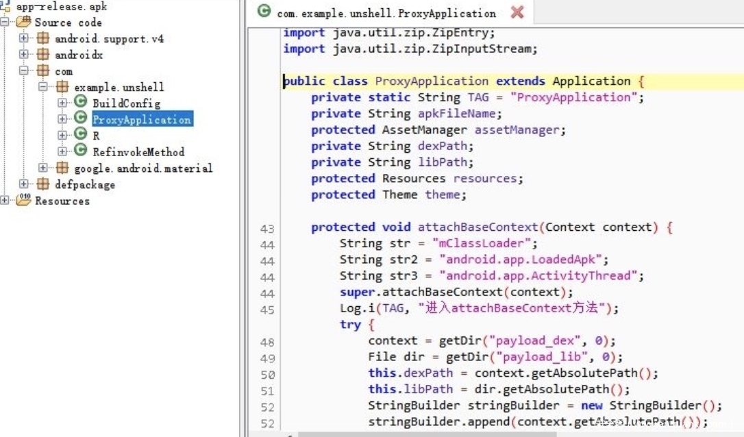 在没有保护的情况下想要破解一个APP,或许你只需要使用apktool, dex2jar等工具,就可以清楚且完整的看到一款产品的原始代码逻辑,以及一定的逆向思维就可以搞定。而最先开始的也是最为常用的保护措施为代码保护。
