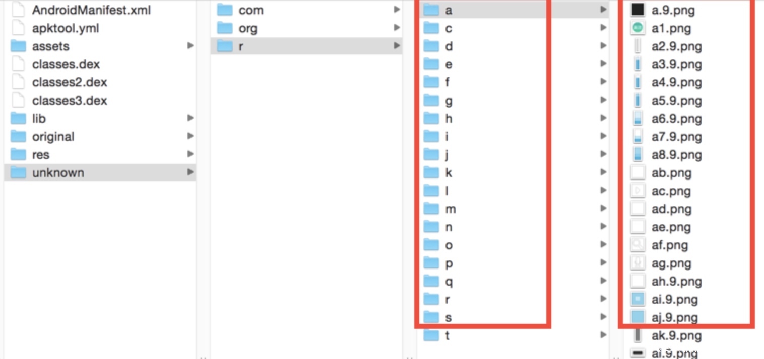 上述代码是在ResourceTable和Assets中添加资源文件时, 对资源文件名称进行修改,这就能够做到资源文件名称的替换,这样通过使用修改过的AAPT编译资源并进行打包,下图是反编译后的截图: