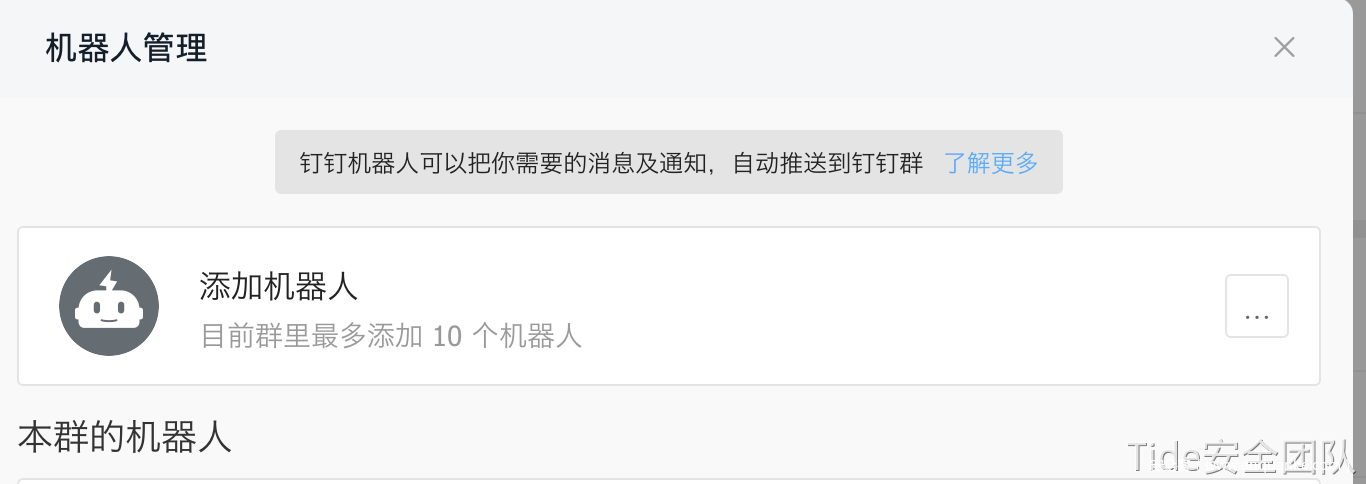 钉钉群和上述的方法基本相同,首先需要在钉钉中拉群一个群聊,并添加一个机器人: