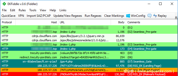 此次攻击活动中,我们可以观察到恶意软件请求了一些常见的地址,这些地址包含我们已知的IP信息,但也用到了比较特殊的gav[0-9].php地址,该地址用来重定向至RIG EK。