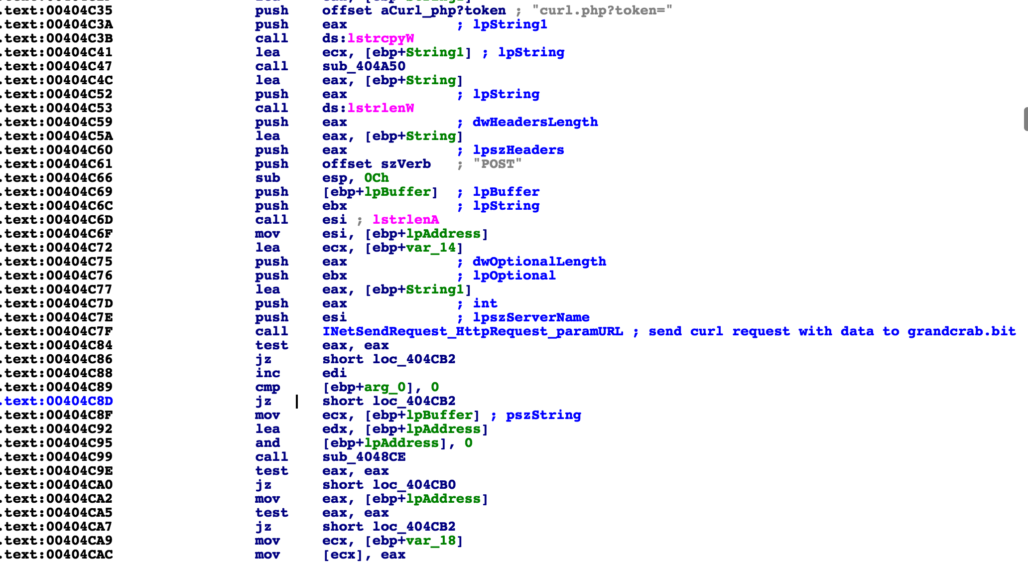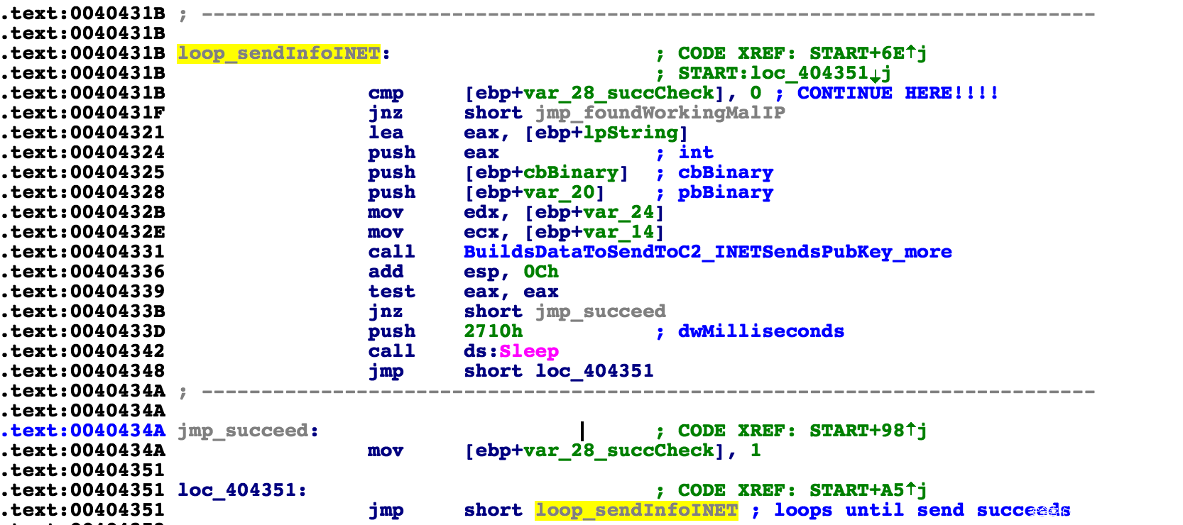 现在,勒索软件会进入主循环,处理互联网相关功能。这部分代码中,如果执行成功,则会进入加密部分代码,否则,恶意软件会不断循环,直至成功为止。如果一直不能成功执行,则恶意软件永远不会加密任何文件。