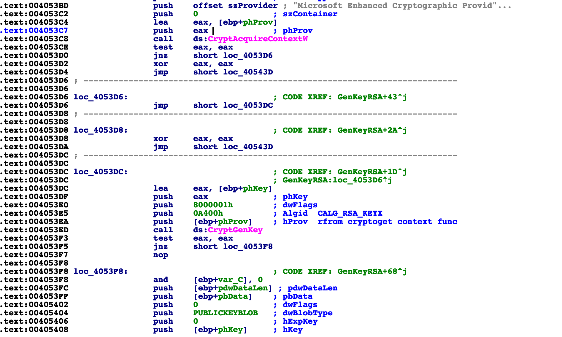 接下来,恶意软件会调用内置的加密函数来生成密钥。GandCrab会在客户端生成公钥及私钥,然后通过Advapi32.dll中的API调用来使用标准的微软加密程序库。恶意软件使用RSA算法来调用CryptGenKey函数。