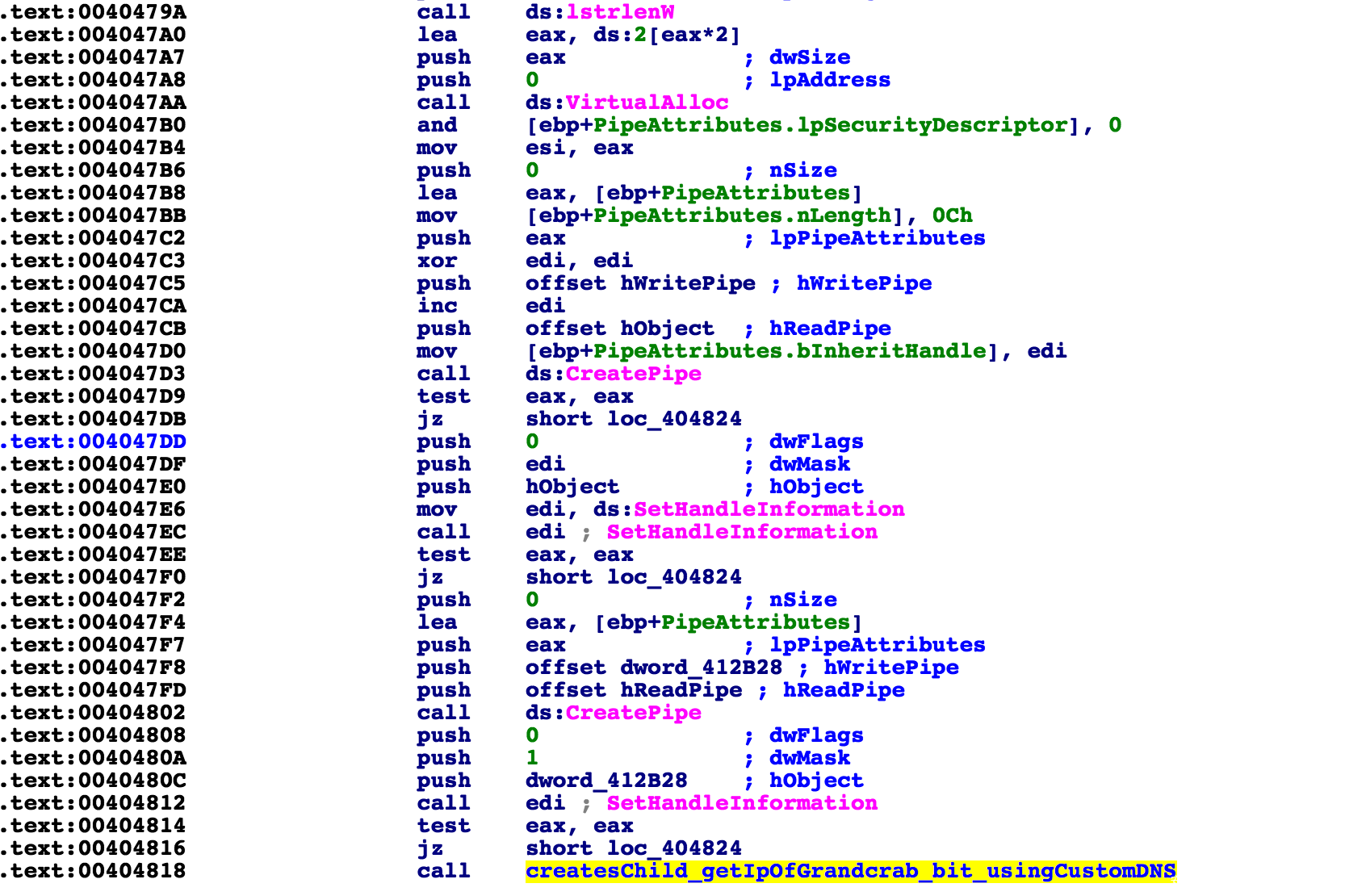 恶意软件创建管道,通过该管道打开NSlookup子进程。这样一来,子进程就可以直接影响父进程的内存,无需手动传输输出结果。这是一种比较有趣又实用的技术,相关代码如下所示: