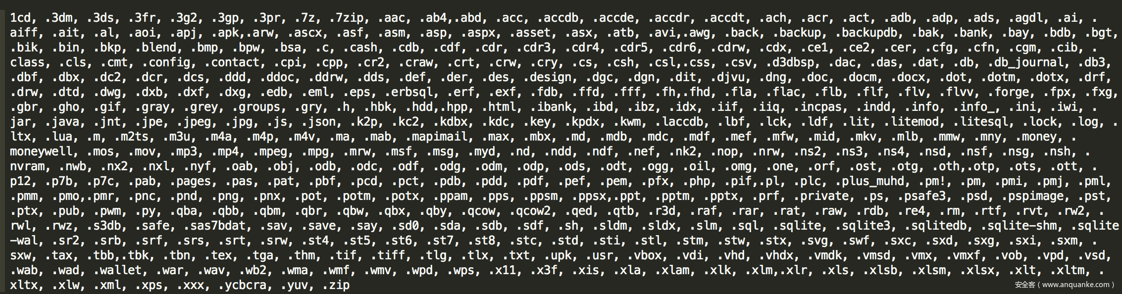通过这些检查过程后,恶意软件会对文件扩展名做最后一次检查,检查该类型的文件是否可以加密处理,可以处理的扩展名如下: