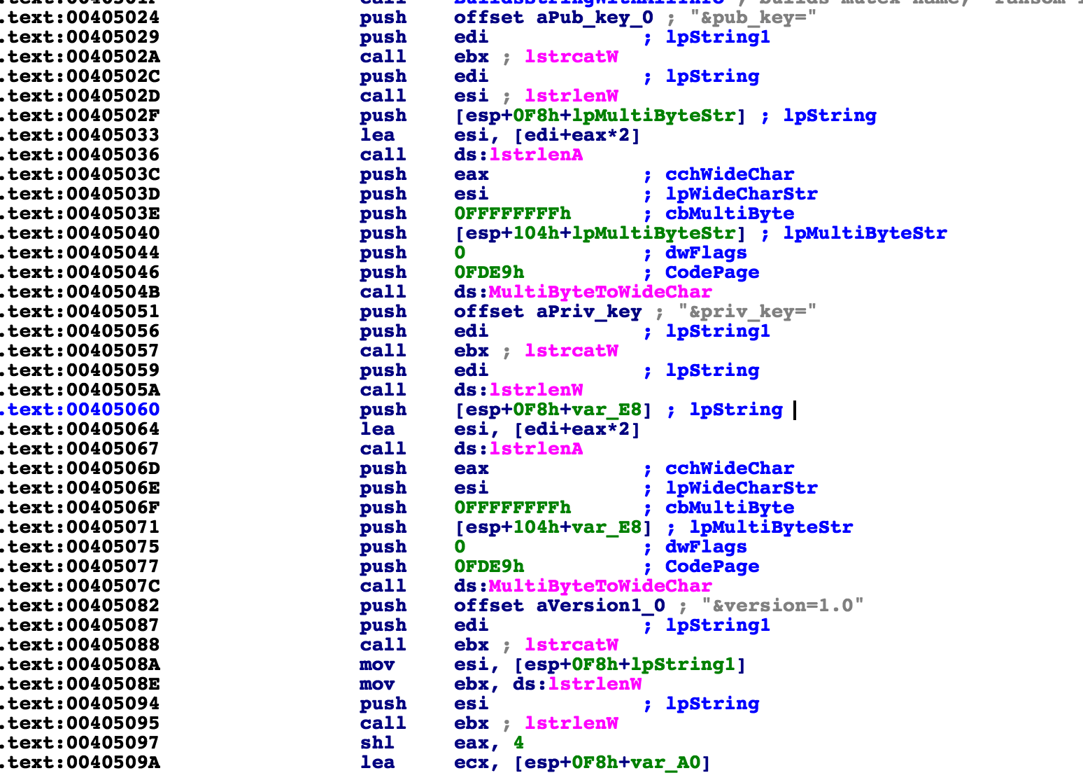 随后,恶意软件开始处理一段二进制数据,这段数据为初始化过程中生成的RSA公钥。恶意软件通过CryptBinaryToStringA API,传入CRYPT_STRING_NOCRLF以及CRYPT_STRING_BASE64参数,将公钥转换为base64编码,并将编码结果加入GET请求字符串中。RSA密钥的生成及转化过程如下。