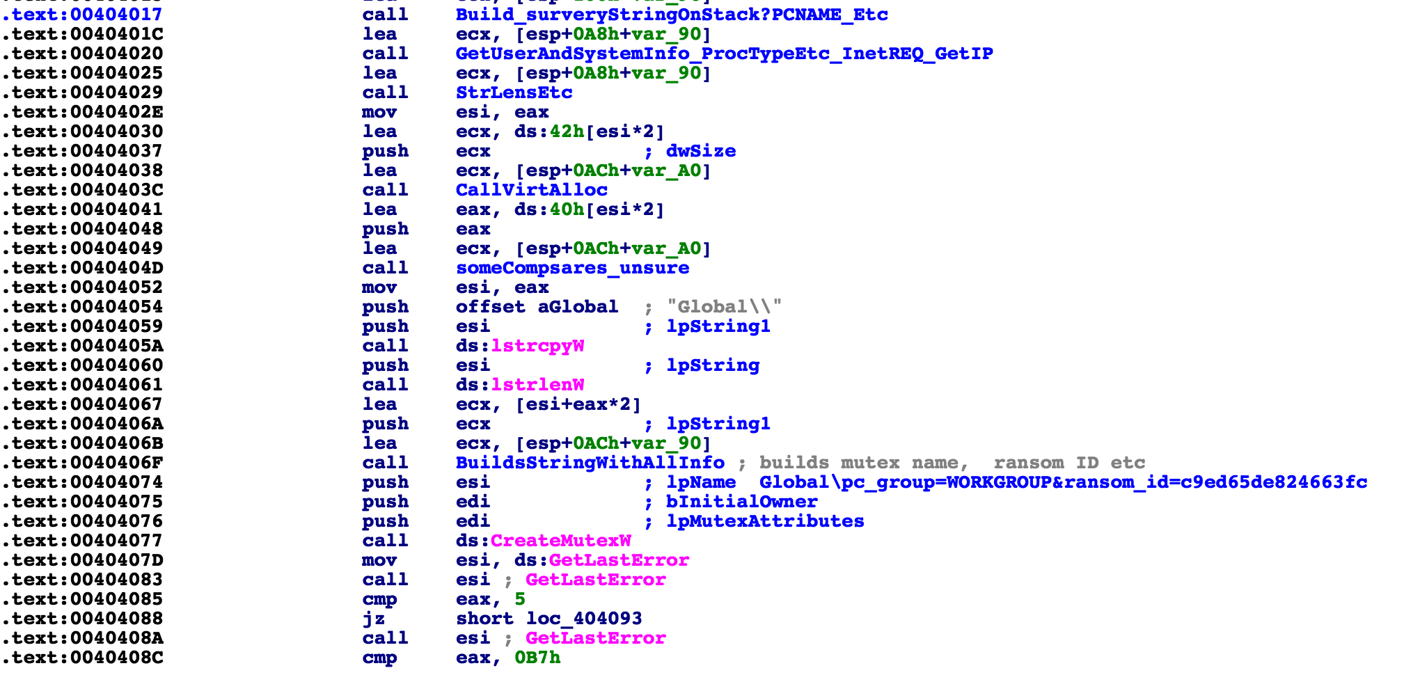 接下来,恶意软件利用收集到的一些系统信息以及生成的ID来创建互斥量(mutex),如下所示: