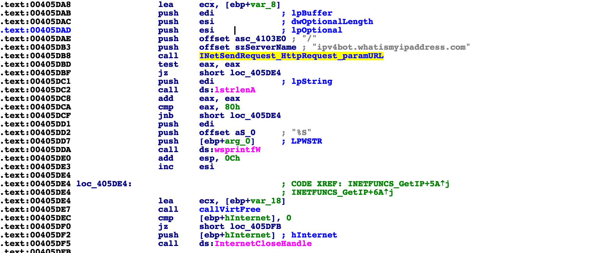 在这部分代码中,恶意软件首先向ipv4bot.whatismyipaddress.com发起GET请求,查询本机的IP地址,然后将其添加到系统信息中,通过GET请求发给服务器。