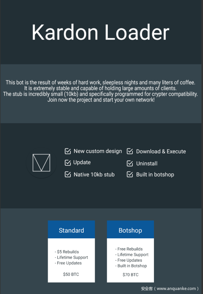 l Kardon Loader的功能特点是允许客户开设自己的僵尸商店(botshop),使得购买者有能力重建bot并出售给其他人;