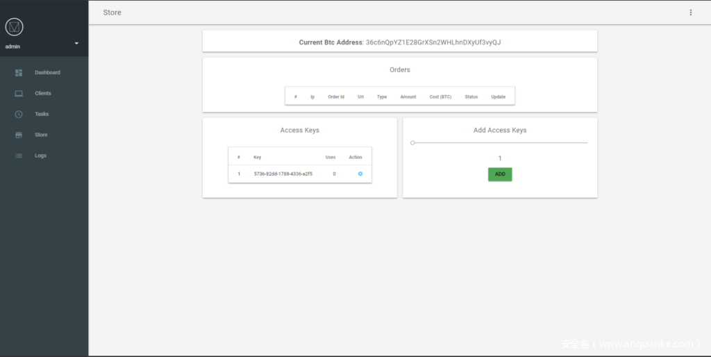 Kardon Loader面板采用了一个简单的设计,由bot分发仪表板和安装统计信息组成。该面板的一个显著特点是bot商店功能,允许bot管理员为客户生成访问密钥,从而使他们能够根据预定义的参数执行任务(图8)。