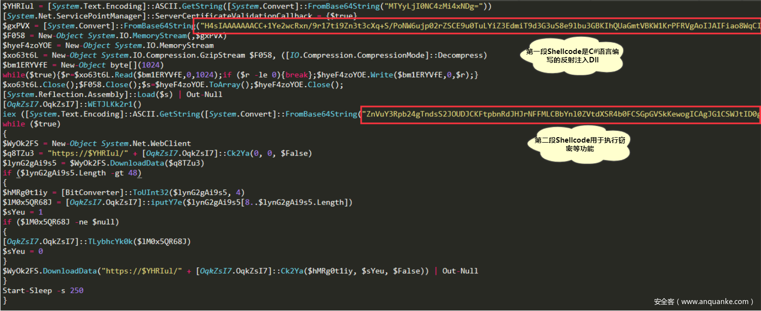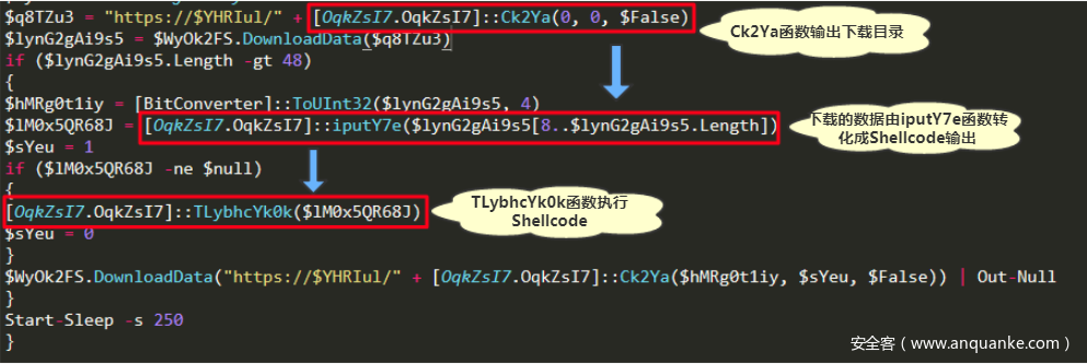 值得一提的是,在这段PowerShell命令中调用了[OqkZsI7.OqkZsI7]类的成员函数Ck2Ya和WETJLKk2r1而未见到[OqkZsI7.OqkZsI7]类的声明。这实际上是对PowerShell内嵌.NET Framework灵活应用。在Powershell中可以使用.NET Framework的类库,也可以使用C#语言的语法定义并执行函数。这段Powershell命令中并未直接写入.NET代码,而是通过反射注入的方式将C#语言编写的dll(第一段Shellcode)载入内存,Dll中对[OqkZsI7.OqkZsI7]类进行声明,并提供Ck2Ya、WETJLKk2r1等成员函数供PowerShell使用。