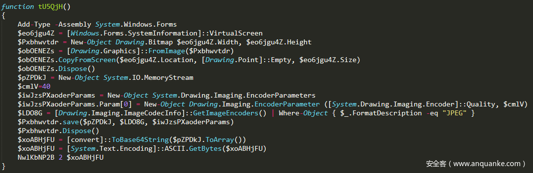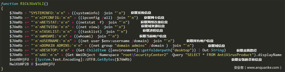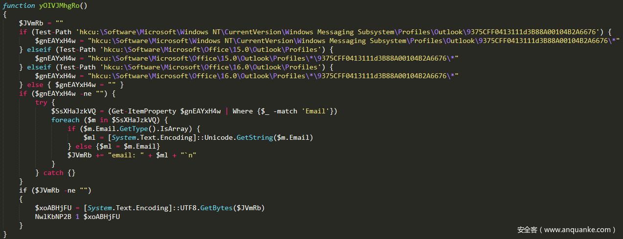 第二段Shellcode则是完成TrickBot的主要功能,包括获取系统信息、获取Outlook邮箱帐户和密码以及上传屏幕截图。这些功能都由PowerShell完成。