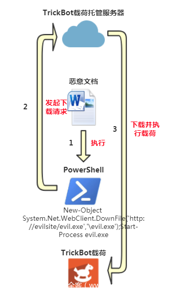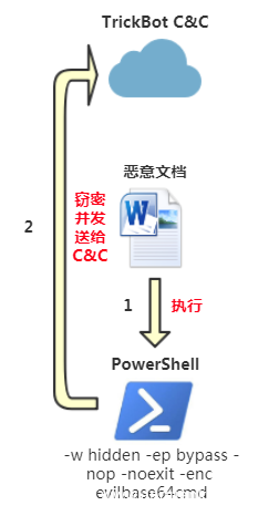 过去的“TrickBot”银行木马一般通过带有恶意宏的Office文档启动PowerShell应用程序下载载荷到本地执行,这么做会导致载荷文件落地,一旦载荷文件被杀毒软件查杀攻击即宣告失败。图1展示了过去的“TrickBot”变种攻击流程
