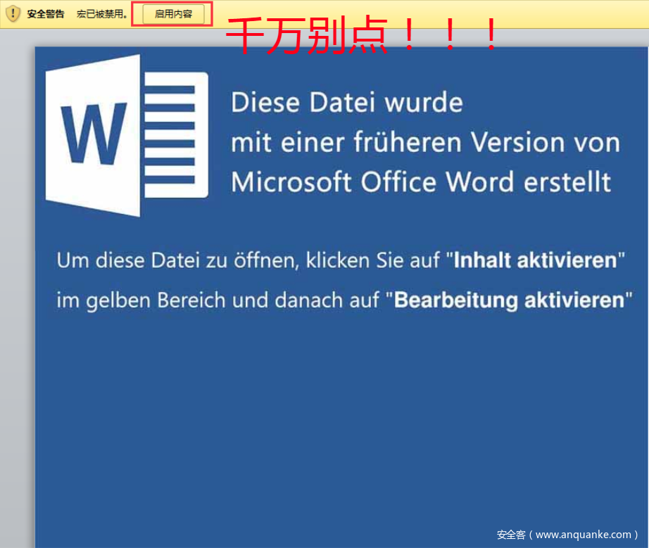 - “TrickBot”银行木马一般通过宏执行恶意功能,而宏是默认禁用的。当接收到未知来源的Office文档时,千万不要启用宏。