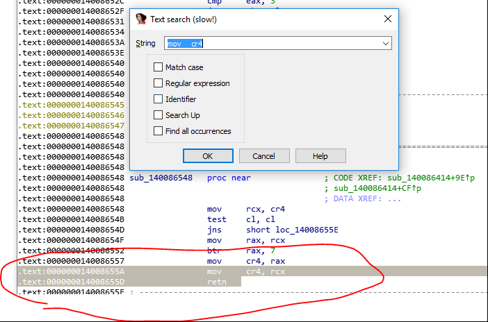 我们将ntoskrnl.exe用ida打开。搜索 mov cr4