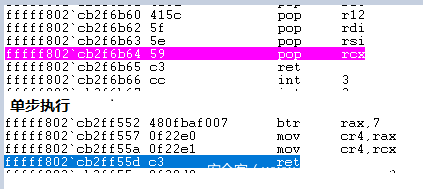 我们实际跟踪下看下smep是什么情况。在我们构造shellcode覆盖堆栈后,执行到RtlCopyMemory((PVOID)KernelBuffer, UserBuffer, Size)后,在TriggerStackOverflow()返回前,我们看下cr4的值。