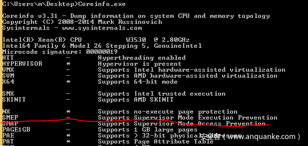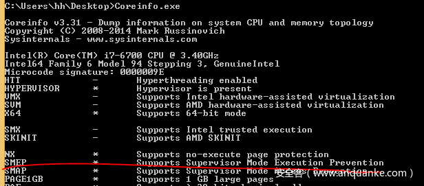 如何判断我们的系统是否开启smep呢。 Windows提供了一款工具coreinfo.exe