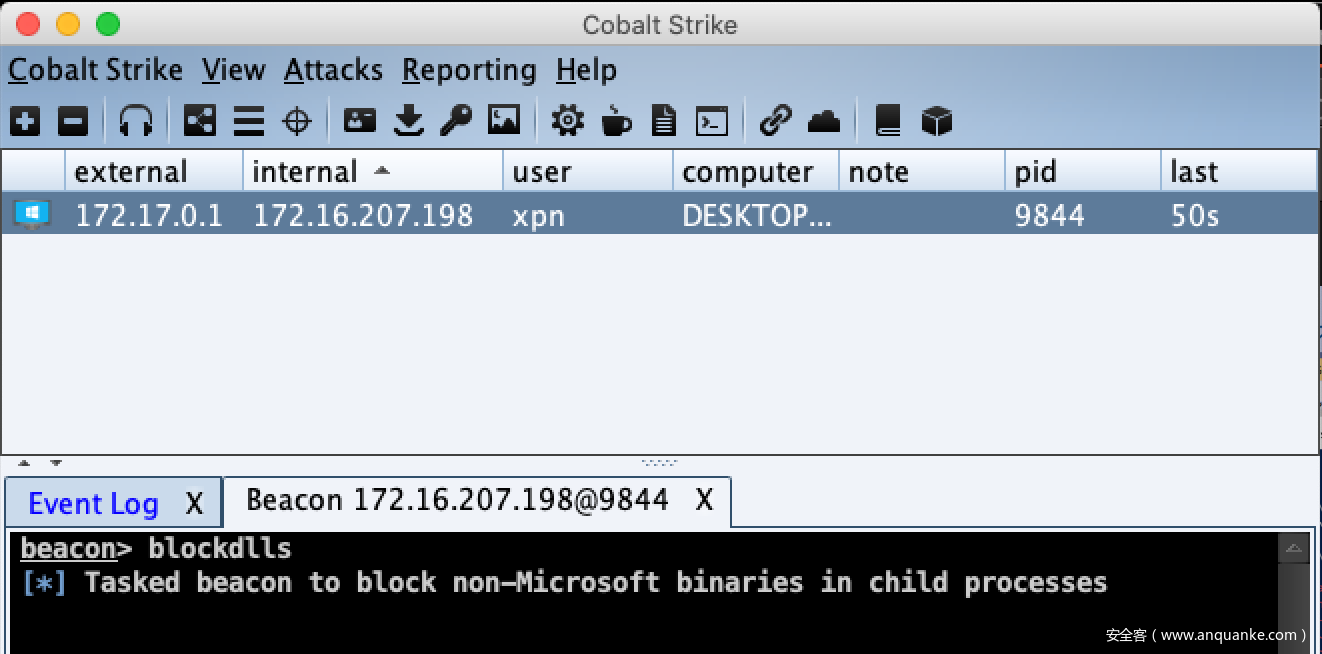 最新版的Cobalt Strike中添加了blockdlls命令,该命令可以避免生成的进程加载非微软签名的DLL,从而达到保护效果。这种方法可以阻止端点安全产品通过DLL加载用户模式代码,避免安全产品hook可疑函数并报告可疑操作。