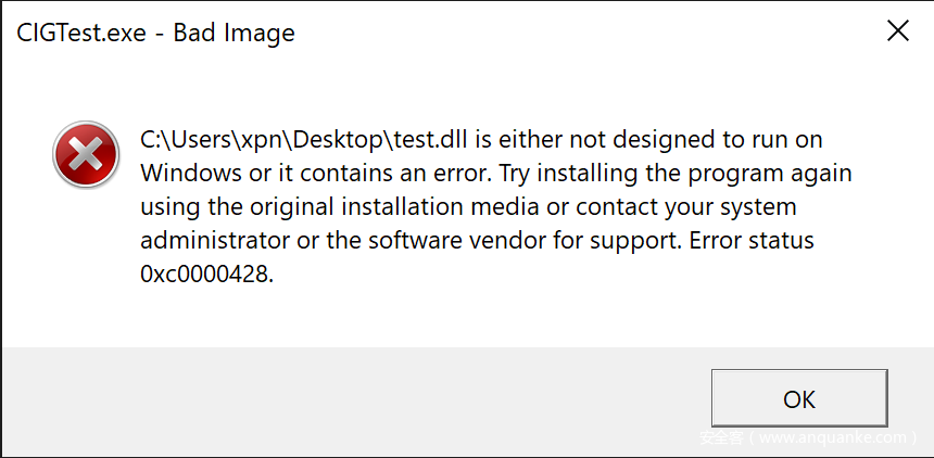 设置该标志后,如果某个未经微软签名的DLL想载入当前进程,就会出现错误,我们可以看到比较详细的出错信息,如下所示: