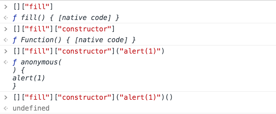 经过一步步拆解,最后执行的JS代码是[]["fill"]["constructor"]("alert(1)")(),那这段代码为啥会执行alert(1)呢,通过控制台分解看下。
