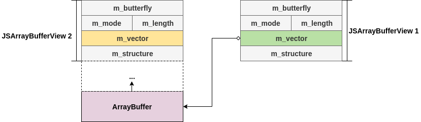 JSArrayBufferView对象有一个到它的数据缓冲区的引用字段。破坏这个引用允许任意读/写原语。