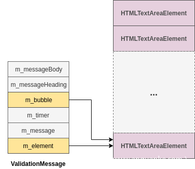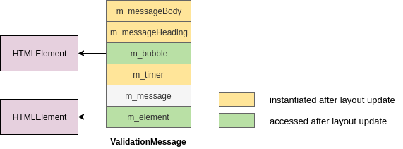在布局更新之后,黄色的字段被实例化(m_messageBody, m_messageHeading)或者被重新实例化(m_timer)。绿色的字段(m_element和m_bubble)每个指向一个HTMLElement实例,在布局更新后被访问。